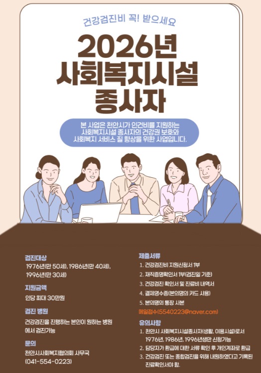 2026년 사회복지시설종사자 건강검진비 지원사업 안내 페이지 정보 작성자작성자 : 천사협 조회조회수 : 45회 작성일작성일 : 26-03-03 15:54 본문 2026년 사회복지시설종사자 건강검진비 지원사업 안내드립니다. 첨부파일 건강검진비 지원 신청서2026년 최신본.hwp (20.5K) 0회 다운로드 | DATE : 2026-03-03 15:54:09 목록 다음글2026년 예산서 공고 25.12.31
