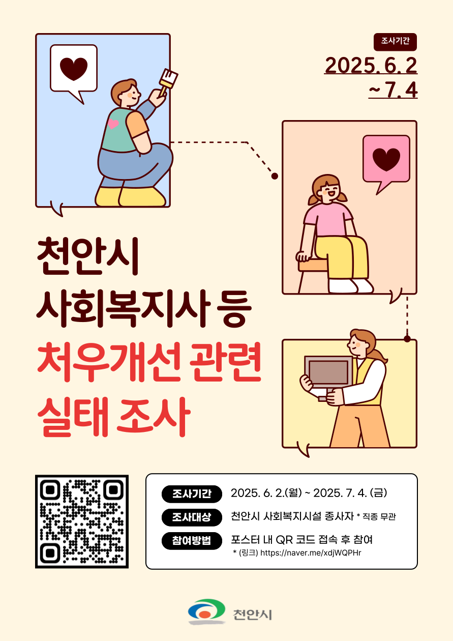 천안시에서는 사회복지시설 종사자 분들 대상으로 처우개선 실태를 조사하고 있습니다.